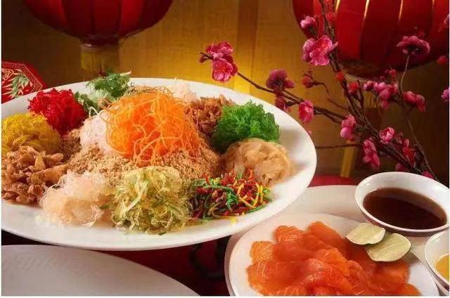 捞鱼生更是新加坡最有特色的美食之一:捞鱼生是以三文鱼片(红色喜庆)为主食材,搭配腌姜丝及各种有颜色的萝卜丝及青丝红丝,还有柚子肉,呈现出来七彩绚丽的鲜艳颜色。再配以花生碎,白芝麻,胡椒粉,酸柑汁,麦芽糖浆等佐料。亲朋好友们一边将其高高夹起,一边以广东话说:“捞起!捞起!(捞喜)捞到风生水起,金玉满堂,富贵吉祥”等等吉利的祝福词语,把鱼生盘中的材料夹得愈高,来年就会赚得越多,在新的一年中更容易实现心愿。这也是每一个成年人的期待吧!