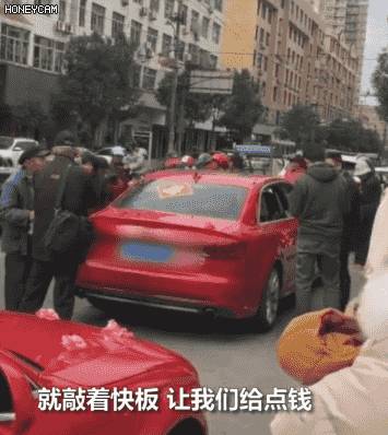 据新郎嫂子陈女士介绍,“当时婚车停在酒店门口,等新娘下来上车的时候,突然出现了一帮大爷大妈,他们开车三轮车就拦在我们的主婚车前面,然后一边敲著快板,一边让说让我们给点钱。”
