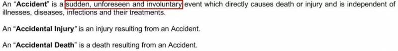 以上两项赔偿都要满足“意外”这一条件,保单中对意外的定义是: