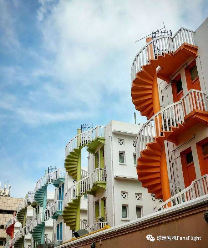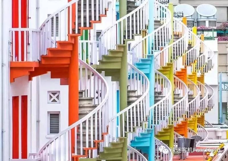 这些披着“多彩外衣”的旋转楼梯是不是非常好看!在这里,不用刻意找角度,怎么拍都是大片,蓝天、白云、彩色的螺旋形楼梯。