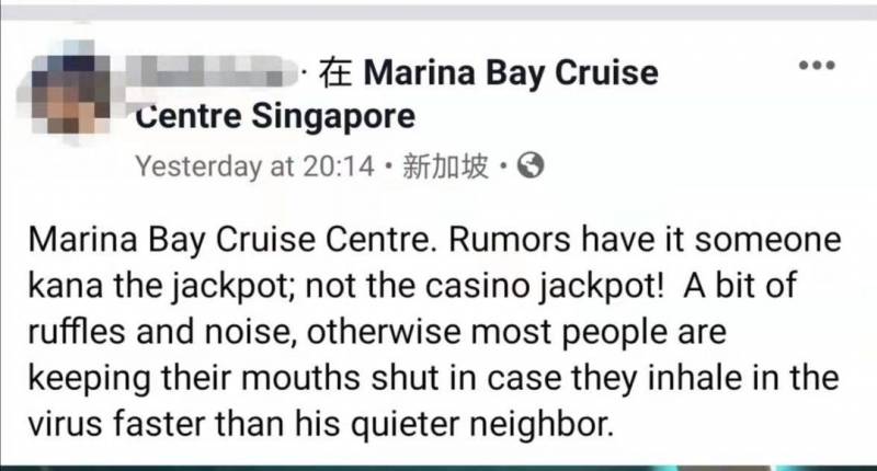 译文:“滨海湾游轮中心,有谣言说有人中了‘大奖’!不是赌场的‘大奖’! 有点烦躁和吵!大家都别吵了,不然他们会比他们的邻居更快感染病毒。”