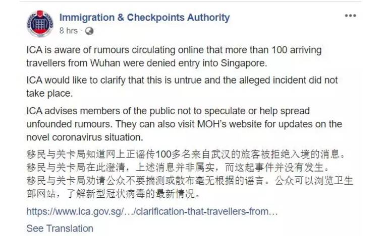 移民与关卡局在此澄清,上述消息并非属实,而这起事件并没有发生。移民与关卡局劝请公众不要揣测或散布毫无根据的谣言。公众可以浏览卫生部网站,了解新型冠状病毒的最新情况。