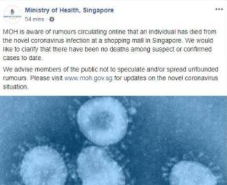 1月25日下午,新加坡卫生部在面簿贴文,指网传本地一个购物中心有人因武汉肺炎逝世是虚假消息。