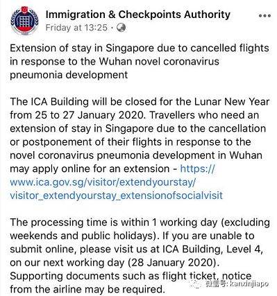 针对这一情况,新加坡的移民与关卡局今天(1月26日)下午发文表示,飞往武汉航班被取消的乘客可以在ICA官网提交相关机票订单、航空公司通知等文件延长旅游签证。