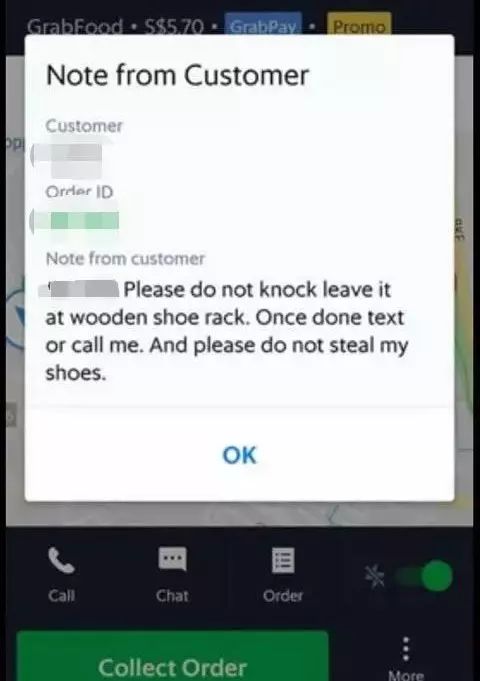 话说,这件事还让其他Grab外卖员受到波及,有顾客在点餐时表示:外卖到了放在鞋架上就好,放好了发短信或打电话告知自己,不要偷自己的鞋……