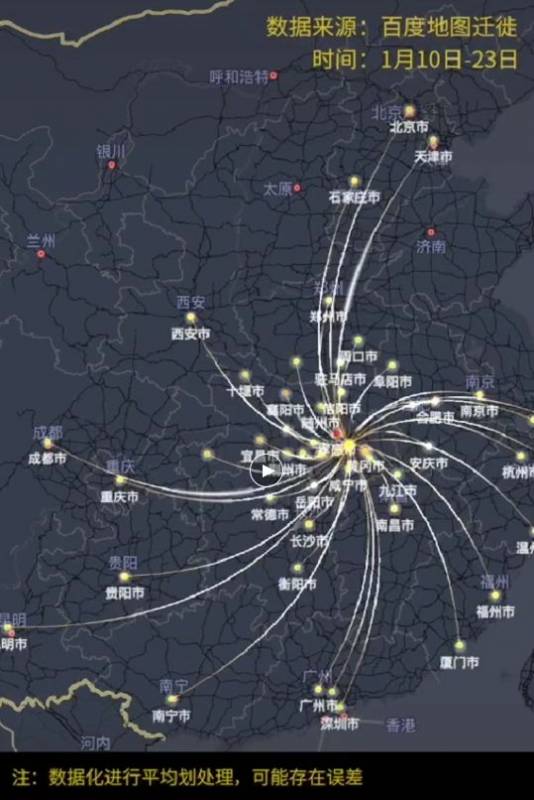 百度地图慧眼的迁徙大数据显示,1月10日至1月22日春运期间(也就是在武汉封城之前),每天从武汉出发的人群中有60%至70%的人前往了湖北省内的其他城市,其次是河南省、湖南省、安徽省、重庆市、江西省。