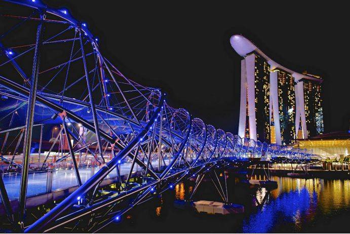 螺旋桥(澳洲Cox Rayner+新加坡61 Pte 2009联合设计,获2010世界建筑节大奖)概念是将桥体弯曲,形成一个拱形,目的是为了使桥身流畅地连接河道两侧的人行大道。这座桥梁想要体现的意义是“生命与延续、更新与成长。2010 年4月24日晚盛大开通。