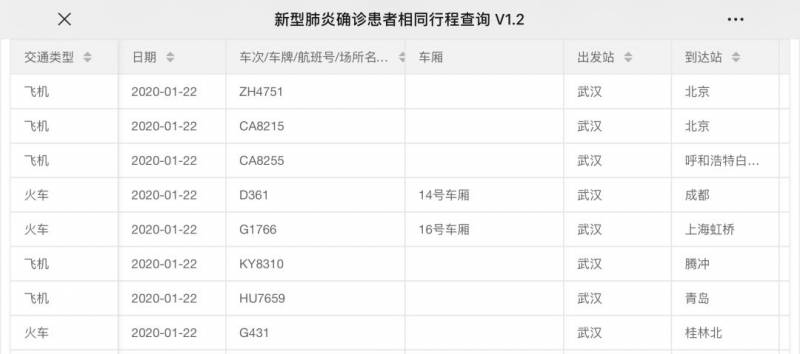 在网站上填入出行时间,车次或去往的区域后,网站会显示检查出确诊患者的车次航班,囊括了飞机、火车、地铁等常用交通工具以及公共场所信息。