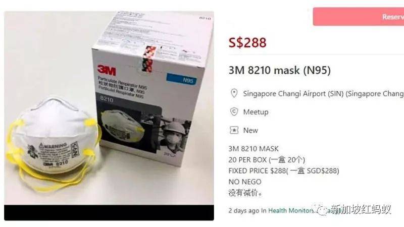 Carousell也有人高价卖N95口罩,一盒20个N95口罩被炒高至120新元,有的售价甚至高达288新元。据了解,超市或药妆店售卖的N95口罩,每个售价一般不超过2新元。