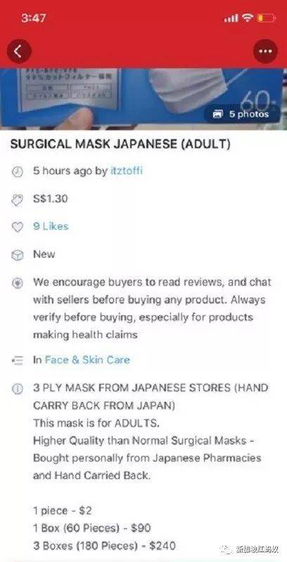 有买家更从日本人肉提口罩回新加坡售卖,一片要价两新元,一盒60片要价90新元,三盒180片要价240新元。