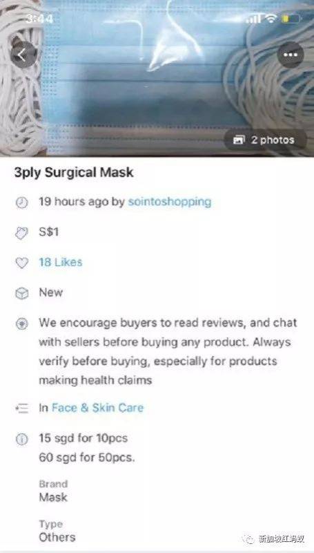 不少公众也开始在网购平台上炒高口罩价格。红蚂蚁在本地网购平台Carousell看到,10片口罩要价15新元,一个也要1.5新元,一盒50个口罩要价60新元。