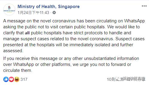 “针对最近网络流传有一名人士在新加坡某处购物中心因感染武汉肺炎而死亡的谣言,我们想要澄清,截至目前为止没有任何疑似或确诊病例死亡。”