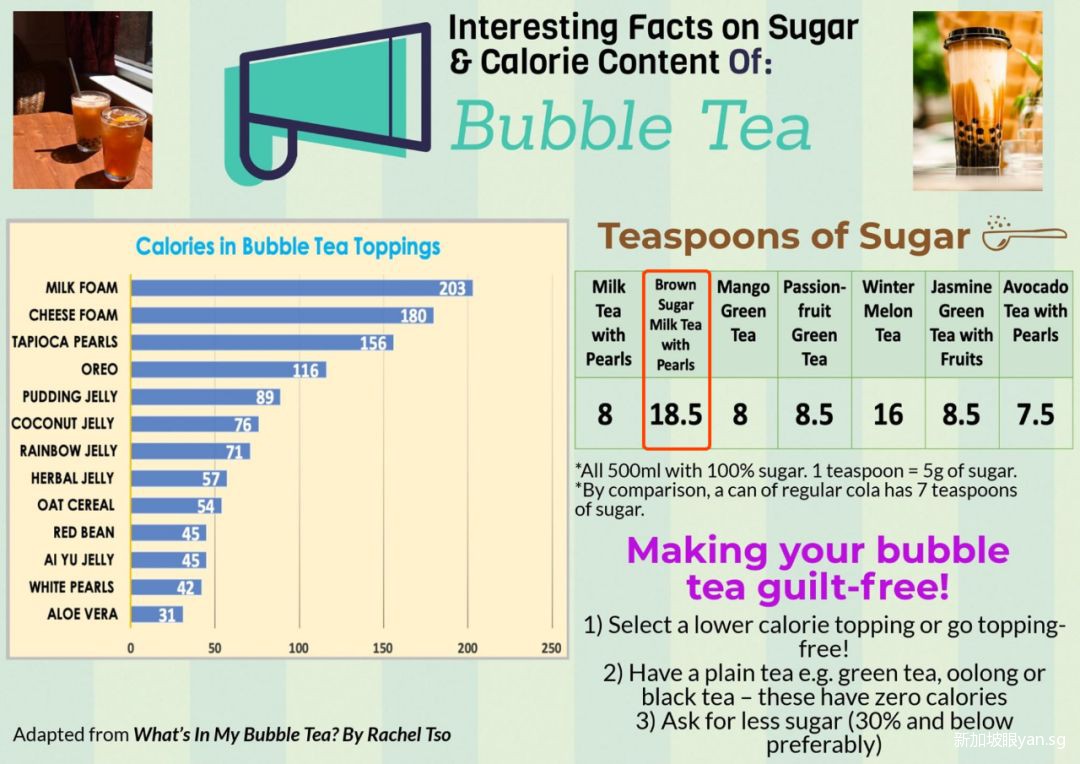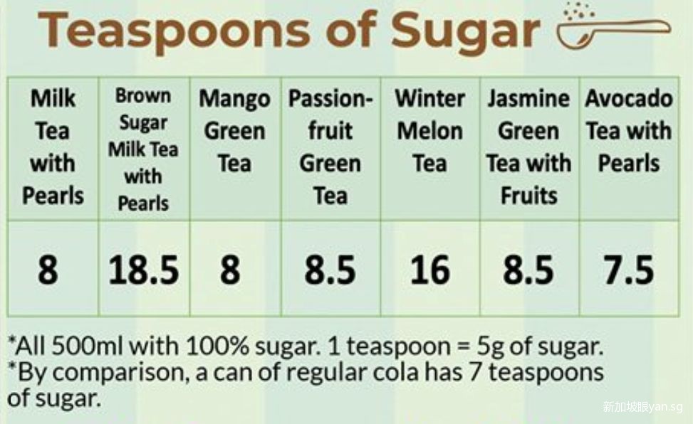 这份数据来自新加坡医院 Mount Alvernia的调查研究报告。据统计,每杯100%糖分的黑糖珍珠奶茶,含有高达18.5匙糖,是所有奶茶中最高的!