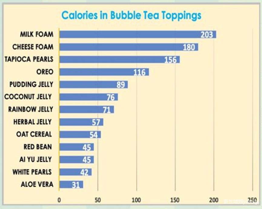 热量最高的配料是奶泡(203卡路里),芝士泡沫的热量紧跟其后(180卡路里)。而大家最爱的珍珠,以156卡路里位列第三!