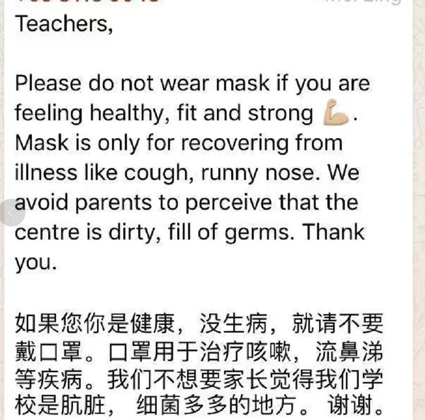 爆料的当事人为本地一所幼儿园的老师,据她所说,她所在的学校不允许员工戴口罩,原因竟然是学校认为戴口罩是愚蠢,肮脏的。在她出示的一封学校给老师发送的邮件中,校方描述道:“如果你没生病,就请不要戴口罩,因为口罩是用于治疗咳嗽,流鼻涕等疾病。校方同时还表达了一种担心,即不想让家长觉得他们学校是肮脏和布满垃圾的地方。