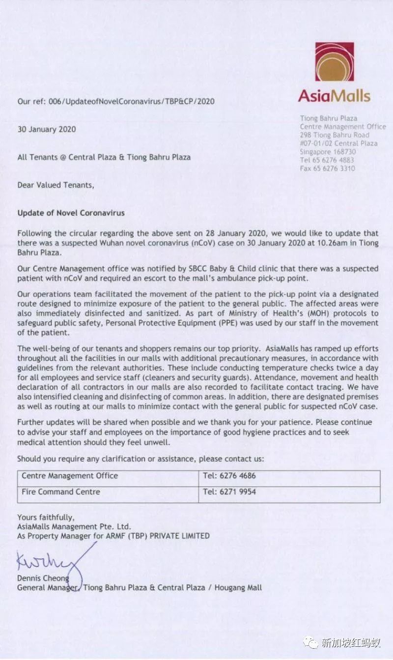 “今早,一名病人到SBCC位于中峇鲁广场的诊所看病。经检测,初步怀疑可能是武汉肺炎疑似病例,诊所员工于是护送该名病人到一间隔离室休息,并拨电通知卫生部。这名病人过后被带去医院。今天下午,该名病人的新型冠状病毒测试呈阴性,已经出院了。诊所也按照卫生部的指示,将诊所彻底消毒。我们会继续与卫生部紧密合作,关注局势发展,有必要时加强诊所内的流程,确保病人与工作人员的安全与健康。” 继武吉班让一带的购物商场山乐坊(Hillion Mall)今早被爆出(29日)傍晚有武汉肺炎可疑病患前去商场内的诊所求诊后,位于中峇鲁地铁站正上方的中峇鲁广场(Tiong Bahru Plaza)今早10点半左右也出现一起武汉肺炎疑似病例,被救伤车送离商场。中峇鲁广场的物业管理公司Asia Malls是在(30日)上午10点26分,接获商场二楼的儿童专科诊所SBCC Baby and Child的“求救”电话,得知诊所内有一名武汉肺炎疑似病患,需要有专人将病患护送到商场一楼的候车处,让救护车可以将他接走。Asia Malls物业公司于是启动紧急应对措施,派出按照卫生部指示穿上个人防护装备(Personal Protective Equipment, PPE)的人员,护送病患由一条远离公众的特定路径下楼,将接触到公众的风险减至最低,并且随即将受影响的区域都进行消毒。随后还发出通告给所有位于中峇鲁广场与相连的Central Plaza的租户,告知此事以及处理方式。以下是蚁粉发给红蚂蚁的通知书。