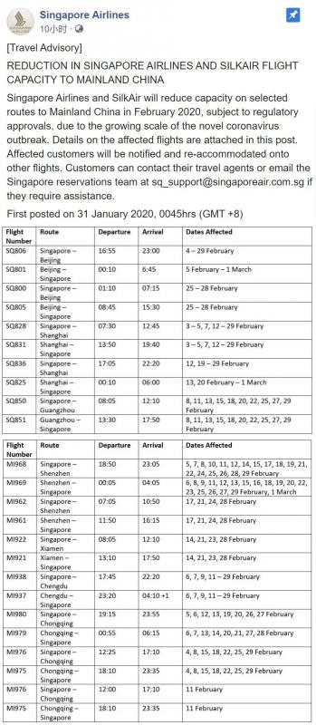 与此同时,新加坡航空及胜安航空也会自2月起减少赴中航班。