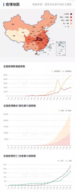 截止1月31日,国内确诊病例达9810例,疑似15238例,死亡213例,治愈183例。疫情较前几日趋于严重,死亡及治愈人数均上升。