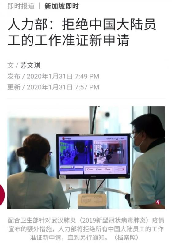 配合卫生部针对武汉肺炎(2019新型冠状病毒肺炎)疫情宣布的额外措施,人力部将拒绝所有中国大陆员工的工作准证新申请,直到另行通知。