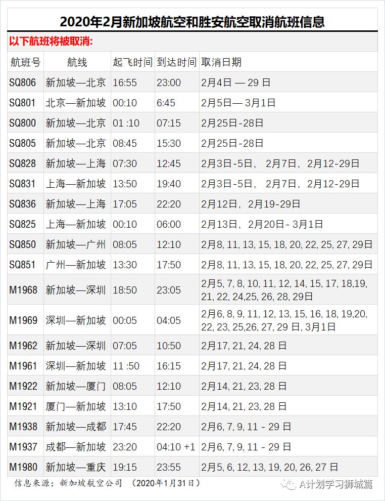此外,新加坡与广州、南京、澳门、香港之间的部分航班也将被取消。受此航班取消影响的旅客将会收到与上述相关退改签邮件通知。感谢您的理解与支持。