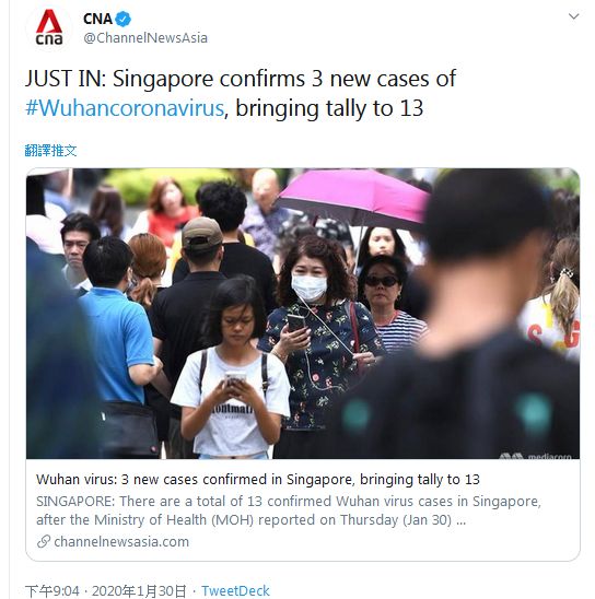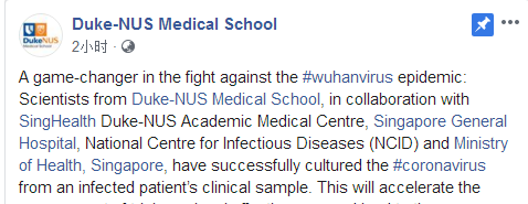 今天(1月31日)杜克-新加坡国立大学医学院在官方脸书上发布公告,他们与中央医院、新加坡保健集团属下医疗中心、国家传染病中心(NCID)和卫生部紧密合作,已成功从受新型肺炎感染病人的临床样本中,复制出2019新型冠状病毒!