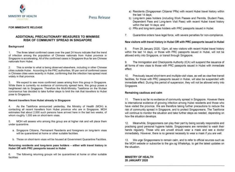 1月28日,新加坡卫生部发布暂停湖北籍游客入境或转机等防控措施,具体内容包括: