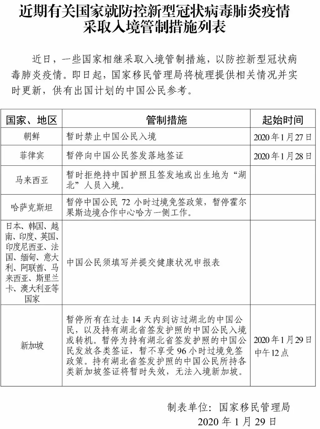 中国国家移民管理局还发布了官方通告,确认并整理了一些国家对中国公民采取入境限制措施。