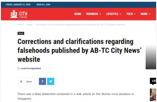 卫生部通过防止网络假信息和网络操纵(POFMA)办事处令该网站、林鼎和该面簿账户刊登更正启事。三者纷纷删除文章和贴文,并遵从指示,说明截至昨晚9时,新加坡未出现本地传播,所有确诊病例都是来自武汉的中国人。