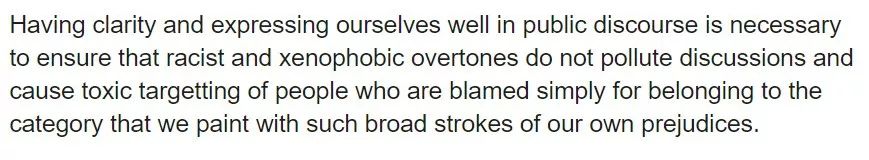 要确保种族主义和仇外色彩不会让讨论变得毫无意义,并引起恶意地针对性。这些人不该被主观的偏见而简单地归类,因此必须在公共场合发表言论时,保证有清晰的自我表达。