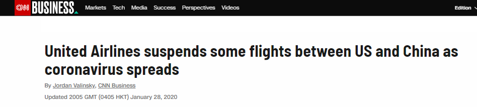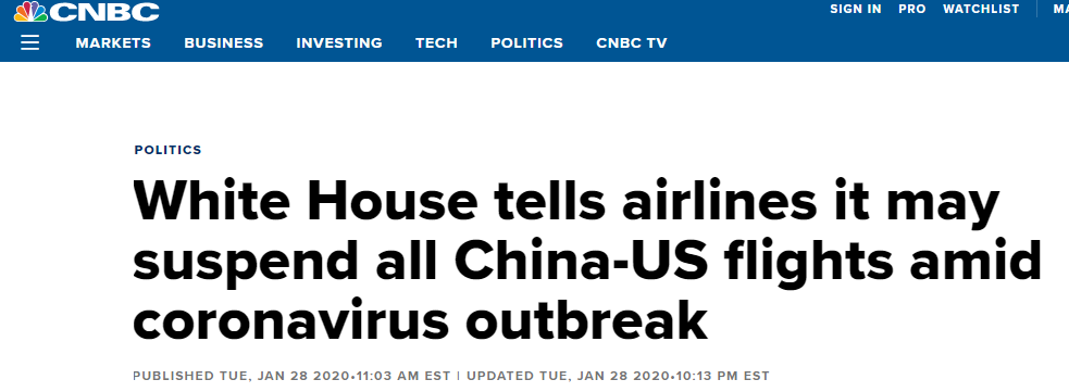 Air Canada ,Air India ,Air Seoul ,Air Tanzania ,American Airlines,Asiana Airlines ,Austrian Airlines ,British Airways ,Cathay Pacific ,Finnair ,IndiGo ,Jetstar Asia,Lion Air ,Lufthansa ,Swiss International Air Lines ,United Airlines 美国CNBC报道 由于担心新型冠状病毒疫情 美国白宫告知美国航空公司 考虑取消中美之间的所有航班