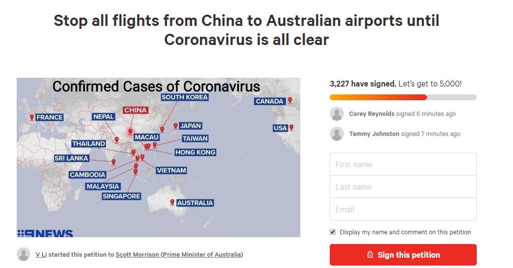 澳洲网友在change.org请愿 暂停中国飞往澳洲的航班 直到疫情结束 有3227人签名