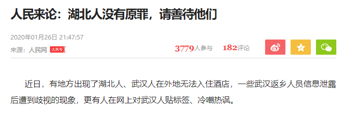 图源:中央日报 不单单是海外,国内也是如此 面对大家“闻鄂色变” 人民网也发表了评论 “湖北人没有原罪,请善待他们” 文中指出: “没有人主动想感染病毒