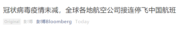 *彭博社报道 昨天,英国British Airways宣布 暂停飞往中国所有航班