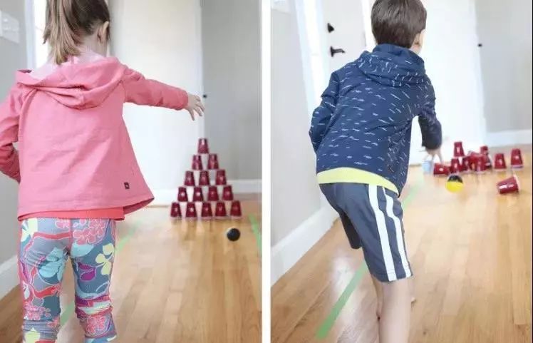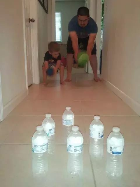 室内保龄球 几个矿泉水瓶子装1/5的水(完全没水不容易站住),随便拿个稍微重点的球就可以开始啦!看谁撞倒的多~球童的工作一定记得交给娃们哟,体力消耗得快,你懂的。如果娃正在学数字的年龄,那么算谁赢的任务也可以交给他啦!