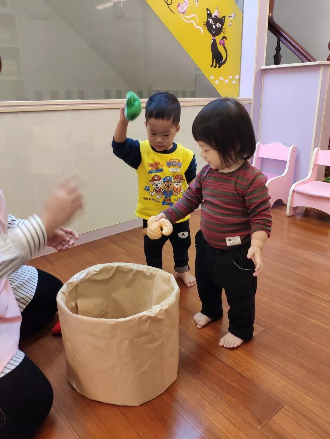 如果不想那么闹,你丢娃接或者让娃往一个桶里丢,也很好玩哦~