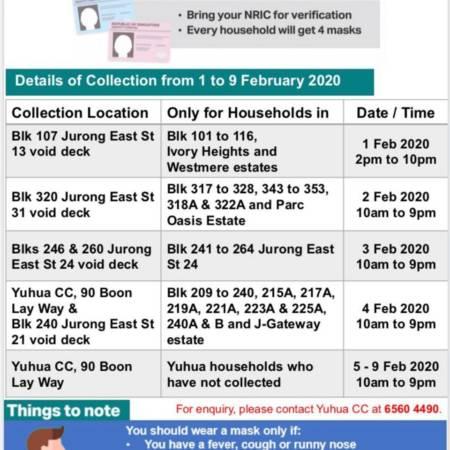 她也透露,住在裕廊东第101座至第116座、绿和园公寓(Ivory Heights)和蔚湄园(Westmere)的居民今天(1日)下午2时开始就可到裕廊东13街第107座组屋楼下领取免费口罩,其他居民则可陆续到其他指定地点领取。