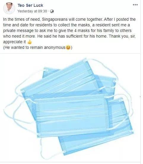 张思乐在面簿发文说,有居民看到他分享领取口罩的详情后,通过私讯表示,希望张思乐帮他送出分配给他们一家的口罩。