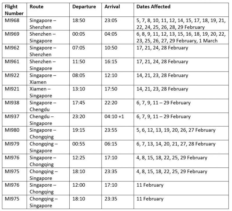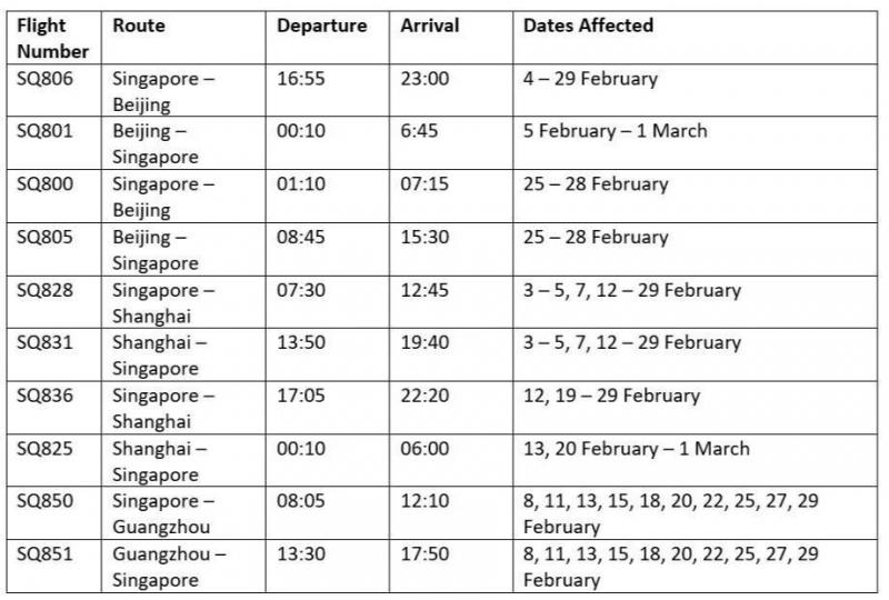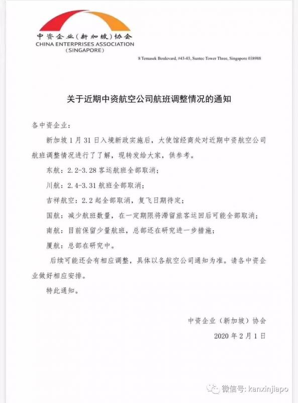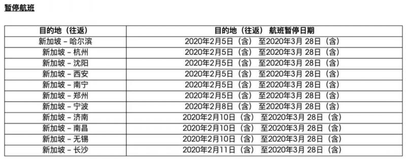 2.国航:取消2月2日-2月29日成都新加坡,新加坡北京航线近几天仍然执行的新加坡出发航班有:2月2日的CA776 (17:45起飞) , 2月2至2月4日的CA970航班(00:05起飞),后续航班取消情况待定。