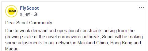 新加坡酷航(Scoot)公告表示,因新型肺炎病毒扩散,用户需求量减少以及出行限制等原因,暂停2020年2月初至3月底,往返于新加坡和中国大陆11个城市之间的航班!