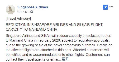 而新加坡航空公司和胜安航空(SilkAir)表示,如获监管部门批准,将在2020年2月减少部分飞往中国大陆的航线的运力,预计将减少从新加坡到北京、上海、广州、深圳、厦门、成都和重庆等城市的部分航班。