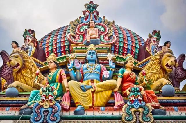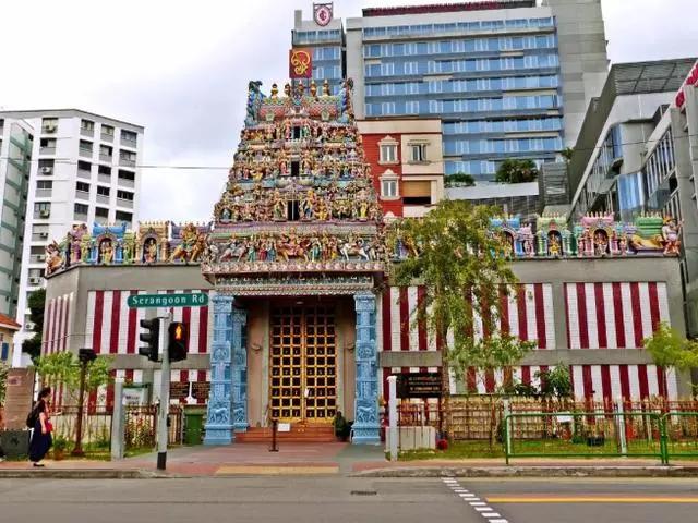 小印度色彩最为艳丽、最具视觉冲击力的宗教场所当属维拉玛卡里雅曼兴都庙。这里供奉着生性残暴的女神卡莉(湿婆神的配偶),她被刻画为"佩戴骷髅项链,正对不幸的人们开膛破肚"的形象,陪她共享宁静家庭时光的是甘尼许和穆卢干,他们都是女神的儿子。