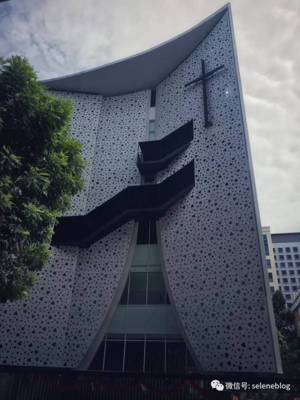 两个相对的建筑,一个是学校,一个是教堂,不同的设计语言,竟然还有呼应