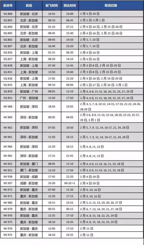 8.春秋:从2月2日~2月底,取消全部新加坡-上海航班。最后一个航班离境时间是2月2日凌晨3点。
