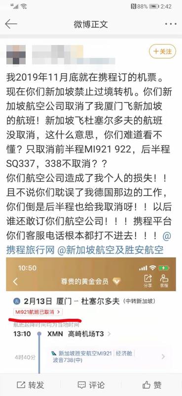 对于航班变化,有网友表示,自己买的飞德国在新加坡转机的机票也被停了,但是只取消了前半程,没取消后半程,网友表示很不满。