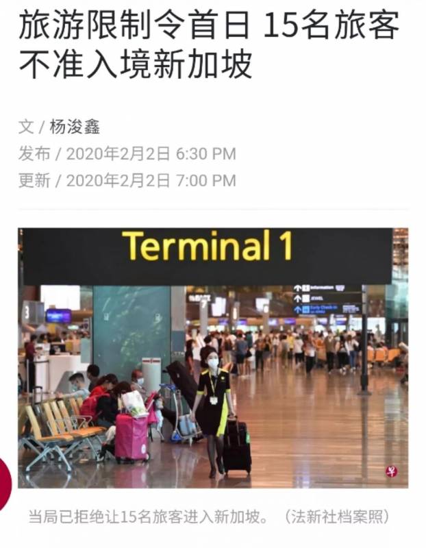 新冠病毒肺炎疫情在湖北以外的中国大陆地区迅速扩散,新加坡也在前天宣布过去14天曾到中国的旅客不论国籍都不能入境新加坡,禁令于昨晚11时59分生效。为有效防堵病毒继续传入我国,持有中国护照的旅客也不准入境。