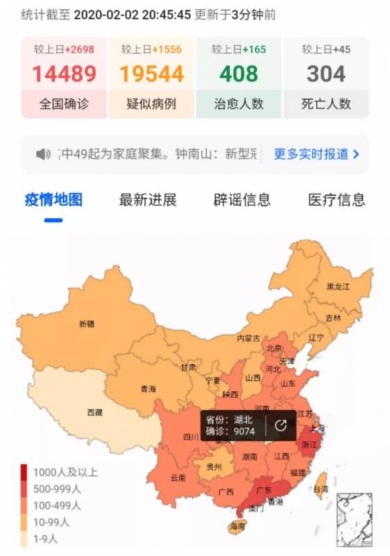 截止2月02日,国内确诊病例达14489例,疑似19544例,死亡304例,治愈408例。