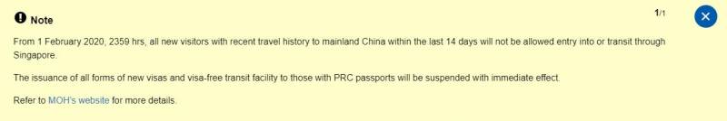 关于新型冠状病毒的新加坡入境提示:自2月2日起,中国公民及在过去14天曾经去过中国大陆的旅客(包括非中国籍旅客)禁止入境新加坡,新永久居民和长期准证持有人可入境并自动主动申请14天休假;暂停给中国护照持有者发放各类新签证,之前已签发的短期签证和多次入境签证以及签证过境便利措施均暂停使用,期间持有人不允许入境!(最新恢复时间我们等待新加坡移民局和中国国家移民局通知!)