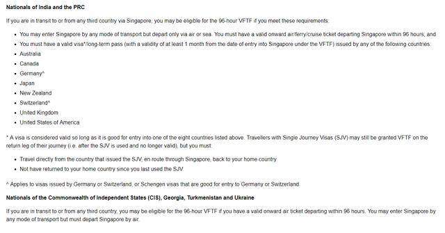 解读:a)就是说只能通过空中或海上离开新加坡。但是可以任何方式,比如坐车进入新加坡。那什么情况下会坐车进入新加坡呢?比如从邻国马来西亚经新加坡转机,你就可以选择坐大巴入境。什么情况下会坐船离开新加坡呢?比如持有从新加坡出发乘坐皇家加勒比邮轮,或者乘坐前往隔壁民丹岛的渡轮,都是从海上离境。b)新加坡移民局严禁根据VFTF计划入境的旅客延长停留期,所以必须要有96小时内离境的有效续程机票、渡轮票或船票。
