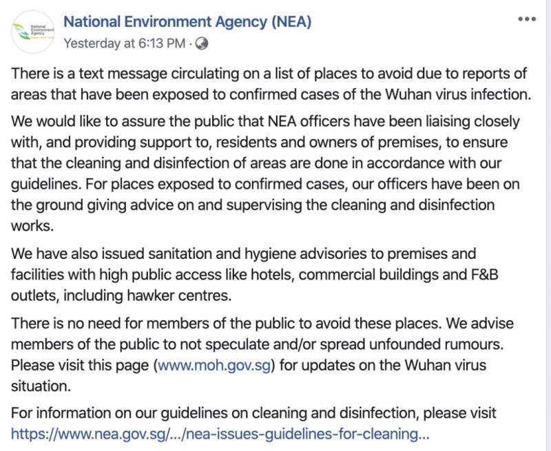 新加坡流传“避开疫区”的名单 环境局发贴文“打假”