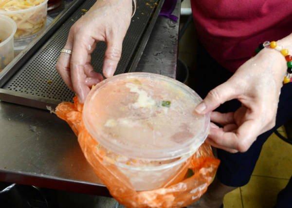 火爆男打开盒盖后,将热粥泼向女摊贩。